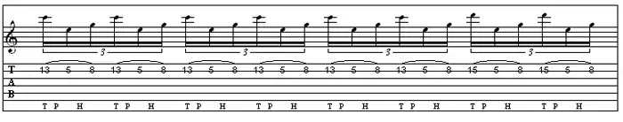 In ihrem Artikel spekulieren die Redakteure über Keyboardtricks, schneller abgespieltes Band oder über zwei zusammengemischte Gitarren. Später kamen einige Gitarristen wie Randy Rhoads oder Steve Vai hinter das Geheimnis dieser Technik, und im Jahre 1982 erklärte Van Halen seine Spielweise öffentlich im Guitar Player. Das virtuose Tapping wurde Markenzeichen seines Stils. Inspiriert zu dieser Spieltechnik wurde Eddie van Halen vor allem durch Jimmy Page, dessen Solo im Song Heartbreaker auf dem Album Led Zeppelin II (1969) auf dieser Technik basierte.[14] Van Halen integrierte das Tapping konsequent und sehr virtuos in seine Spielweise. Am bekanntesten ist die sogenannte Van-Halen-Triole geworden, die am Ende von Eruption zu hören ist: