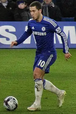 In der nächsten Spielzeit 2014/15 übernahm Hazard die Trikotnummer 10, welche zuvor von Juan Mata bis zu dessen Abgang im Januar 2014 getragen wurde.[108] Diese Saison begann für Hazard und Chelsea hervorragend. Nach einem komfortablen Sieg zum Saisonstart, erzielte er am 2. Spieltag beim 2:0-Heimsieg gegen Leicester City sein erstes Saisontor.[109] Am 7. Spieltag traf er auch beim 2:0-Heimerfolg gegen den großen Rivalen FC Arsenal aus einem Elfmeter. Damit war er zu dieser Zeit in 16 von 16 getretenen Strafstößen in seiner Profikarriere in sämtlichen erfolgreich gewesen.[110] Chelsea war zu dieser Zeit nun bereits seit zehn Pflichtspielen ungeschlagen und in der Premier League Tabellenführer. Am 21. Oktober traf er beim 6:0-Heimsieg im 3. Spiel der Gruppenphase der UEFA Champions League 2014/15 doppelt und gab eine Vorlage.[111] Am 1. November erzielte er beim 2:1-Heimsieg gegen die Queens Park Rangers sein fünftes Saisontor.[112] Zehn Tage später traf er beim 2:0-Heimsieg gegen Hull City zum ersten Mal in seiner Karriere mit dem Kopf.[113]