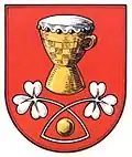 Das Wappen zeigt auf rotem Grund die sogenannte „Edesheimer Tontrommel[9]“, die hier gefunden und als vorgeschichtliche Kulttrommel erkannt wurde. Die im unteren Wappenfeld befindlichen schräggekreuzten und unten verbundenen Kleestengel in Silber umschließen eine goldene Kugel und sind dem alten Hauswappen derer von Edessen entnommen, die hier ihren Stammsitz hatten.