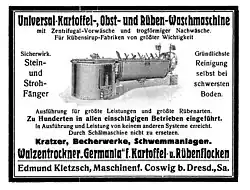 Nach dem Umzug nach Coswig produzierte Kletzsch in großem Umfang Maisch-Maschinen und Hilfsapparate wie Grünmalzquetschen und Pumpen für die Spiritusproduktion.[34] Besonders erfolgreich waren offenbar die schon von Hampel patentierten und von Kletzsch weiterentwickelten Maische-Entschaler.[35] Ab etwa 1915 kamen Walzentrockner und Ventilatoren hinzu. Ein- und Zweiwalzentrockner der Marke Germania für Kartoffel- und Rübenflocken waren die einzigen, deren Walzen statt mit Dampf auch mit 230 °C heißem Öl beheizt werden konnten.[36] Dadurch ließen sich Druckleitungen für Dampf vermeiden. Bei elektrischer Beheizung konnte man sogar auf Dampfkessel verzichten.[37]