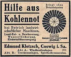 In den 1920er Jahren kam als zweites Standbein die Produktion von Windturbinen hinzu.[26] Drei Jahre nachdem seine Ehefrau 50-jährig an Rippenfellentzündung gestorben war, nahm sich Edmund Kletzsch in der Nacht vom 6. zum 7. Oktober 1925 in seiner Wohnung in der Coswiger Kirchstraße 5 das Leben.[27] Im Januar 1926 übernahm sein Sohn Martin die verschuldete Maschinenfabrik.[24] Zwei Jahre später wurde ein Konkursverfahren gegen ihn eröffnet.[24] In dessen Folge erwarb die in Milwaukee ansässige Firma Kletzsch Realty Company[28] das Fabrikgrundstück mit allen darin befindlichen Maschinen, Werkzeugen und Betriebsbeständen.[24] 1930 erlosch die Edmund Kletzsch Maschinenfabrik im Handelsregister. Martin Kletzsch arbeitete 1938 als Wehrmachtsangestellter beim Heeres-Gruppenkommando 4 in Leipzig[24] und ging später nach Magdeburg, wo er sich 1943 in seiner Wohnung erschoss.[23]