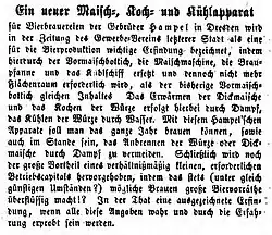 - Patent DE352: Maisch- und Kühlapparat mit Mischrad und Ventilator. Angemeldet am 5. Juli 1877, Erfinder: Johann Hampel (DRP).