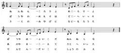 - ↑ a b 江戸の子守唄 - 東京都民謡(楽譜). NPO法人日本子守唄協会, archiviert vom (nicht mehr online verfügbar) am 22. April 2012; abgerufen am 16. November 2012 (japanisch). Info: Der Archivlink wurde automatisch eingesetzt und noch nicht geprüft. Bitte prüfe Original- und Archivlink gemäß Anleitung und entferne dann diesen Hinweis.