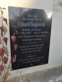 Zu den Nachkommen Rupprechts lassen sich auch noch drei weitere kirchlich interessante Persönlichkeiten rechnen. Sein Sohn Johannes Rupprecht wurde durch seine Forschungen über den bayerischen Oberkonsistorialpräsidenten Hermann Bezzel bekannt. Der Enkel Eduard Putz (1907–1990), unter Landesbischof Hans Meiser zunächst theologischer Mitarbeiter im Landeskirchenamt München, dann Dekan in Erlangen, ist heute vor allem wegen seiner Rolle im Kirchenkampf umstritten.[1] Ein weiterer Enkel, Walter Rupprecht (1918–2007), wirkte als Dozent an der Augustana-Hochschule Neuendettelsau und als Kreisdekan in Augsburg.