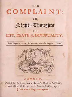 Das Geld, das ihm seine ersten, 1728 erschienenen Satiren eingebracht hatten, verlor Young bei dem sogenannten Südseeschwindel. Youngs Ehe mit der verwitweten Tochter des Earl of Lichtfeld war offenbar sehr glücklich, dauerte indes nur zehn Jahre an. Der Tod seiner geliebten Stieftochter, seines Schwiegersohnes sowie schließlich seiner Frau veranlasste ihn zu seiner berühmtesten Dichtung The Complaint, or Night Thoughts on Life, Death and Immortality 1742–1745 (dt. Klagen oder Nachtgedanken). Das etwa 10000 Blankverse umfassende Gedicht Night Thoughts mit seinen schmerzvoll düsteren und melancholischen Betrachtungen über Tod und Vergänglichkeit sowie Unsterblichkeit, die auch für Novalis’ Hymnen an die Nacht als Vorlage dienten, ließen die Schrift bald zum Lieblingsbuch des gebildeten Europas avancieren. Seinem Vorbild John Milton folgend beabsichtigte Young eine große Kosmologie, die die gesamte chain of being mit Gott, den Menschen, der Gesellschaft sowie der Moral und Tugend im Ganzen aufnehmen sollte. Diktion, Vers und Rhetorik sind dabei zumeist an der klassizistischen Form orientiert; ebenso steht vieles aus der gedanklichen Welt dieser Dichtung Youngs noch in der aufklärerisch-klassizistischen Tradition. Als neue oder gar revolutionär empfundene Elemente zeigen sich neben der schwermütigen Grundstimmung insbesondere Youngs Bilder von Nacht, Grab und Tod sowie sein kraftvoller Psalmen- und Hymnenstil neben dem authentischen Ausdruck tieferer Gefühle auf dem Hintergrund seiner selbst erlebten schmerzlichen Verluste.[1]