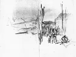 Im Werkverzeichnis von Rouart/Wildenstein ist Effet de neige à Petit-Montrouge als einziges Gemälde Manets aufgeführt, das während der Zeit der Belagerung von Paris entstanden ist.[39] Des Weiteren findet sich in diesem Werkverzeichnis nur eine Zeichnung aus dieser Zeit.[40] Unter der Bezeichnung Soldats se rendant aux avant-postes (Soldaten beziehen einen Vorposten) zeichnete Manet einen gebeugt auf einer Kanone sitzenden Mann neben einer Gruppe umher stehender Militärangehöriger. Ebenso wie in Effet de neige à Petit-Montrouge stellt Manet hier keine heroische Kampfhandlung dar, sondern zeigt die Monotonie des Krieges. Die Zeichnung illustriert die von Manet in seinen Briefen beschriebene Langeweile und das zermürbende Warten.