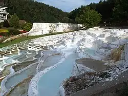 Durch den hohen Calciumgehalt des Wassers (etwa 630 mg/l) und den Druck- und Temperaturunterschied zwischen Reservoir und Oberfläche lagerte sich das Calcium an der Oberfläche in Form von Kalk ab (Fällung). Mithilfe von künstlich angelegten Kanälen wird das Wasser aus dem ehemaligen Bohrloch, das auf einer Anhöhe liegt, an wechselnde Stellen an den Hängen des Hügels transportiert. So entstanden im Laufe der Zeit die ausgedehnten Terrassen aus Travertin, die im Jahr 2013 eine Fläche von 822 Quadratmetern einnahmen. Gelegentlich werden sie in Anspielung auf die – deutlich älteren und größeren – Sinterterrassen in Pamukkale als „kleines“ oder „ungarisches Pamukkale“ bezeichnet.[4]