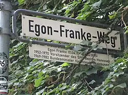 - In Frankes hannoverschem Wohnstadtteil Bothfeld ist seit 2003 der Egon-Franke-Weg nach ihm benannt.