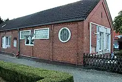 Der schlichte Backsteinbau mit Satteldach ist in eine Wohnsiedlung eingereiht. Die Längsseiten des Gebäudes werden durch Lisenen gegliedert und durch einen Fries abgeschlossen. Auch die Giebelseite zur Straße wird durch einen Fries betont. 1962 wurde der Versammlungsraum umgestaltet.[3] In diesem Zug wurde eine große Fensterfront zur nördlichen Straßenseite eingebrochen und der Haupteingang an die – von der Straßenfront aus gesehen – rechte, westliche Längsseite verlegt. Gleichzeitig wurde dadurch ein kleines Foyer geschaffen, in dem sich Garderoben und der Büchertisch der Gemeinde befanden. An der nördlichen Ostseite waren ein hochsitzendes Rundfenster mit Glasbausteinen und dahinter zwei querrechteckige Fenster mit Glasbausteinen eingelassen. Links von dem großen Fenster an der Straßenseite war ein weißes Kreuz eingemauert, Fenster und Kreuz wurden von einem weißen Rechteck gerahmt.