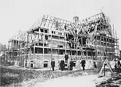 Bauherr des Soldatenheims war der christliche „Norddeutsche Männer- und Jünglingsbund“. 1906 wurden im Norddeutschen Boten, der Monatszeitschrift des Norddeutschen Männer- und Jünglingsbunds, die ersten Entwürfe für das Soldatenheim von einem Architekten namens Petersen aus Hamburg Altona präsentiert. Der Entwurf weist zwei quadratischen Türmen auf der Schauseite auf, sowie einen hinten quer angeordneten großen Saal, der später von Fritz Höger ähnlich realisiert wurde.[2] Die Bausumme war nach zwei Jahren Spendenkampagnen nicht zusammengekommen, und so musste 1910 das Projekt erneut ausgeschrieben werden. Man entschied sich zunächst für den Architekten J. Grotjan aus Hamburg, dessen Entwurf im Norddeutschen Boten veröffentlicht wurde.[3] Erst nachdem dieser Entwurf als zu teuer befunden wurde, ging der Auftrag an Fritz Höger.[4] Er plante einen Dreiflügelbau in Klinkerbauweise mit einem sehr hohen Dachaufbau im Stil der schleswig-holsteinischen Heimatschutzarchitektur.[5][6] Der Bau schritt schnell fort, das Richtfest fand am 6. Juli 1911 statt,[7] die Eröffnung am 6. März 1912.[8] Das Soldatenheim wird seit 2019 in den Originalzustand zurückgebaut.[9][10]