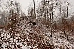 Etwa 80 Meter vom Schildwall entfernt wird der Sporn Richtung Hauptangriffsseite durch einen weiteren Abschnittswall mit Vorgraben gesichert.