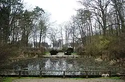 Am östlichen Ende befindet sich ein ovaler Teich. Die Einfassung der einzelnen Gestaltungselemente wurde in Form von schmalen Buchenhecken vorgenommen.