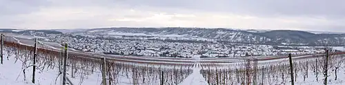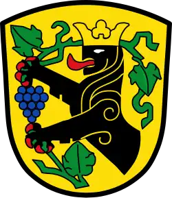 Blasonierung: „In Gold ein halber, golden gekrönter und rot bewehrter schwarzer Löwe, der eine rund gebogene, nach links offene grüne Weinrebe mit Blättern und einer blauen Traube in den Pranken hält.“[6] |