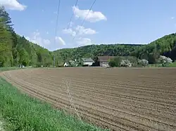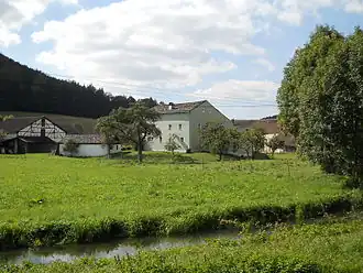 Zu der Einöde gehört ein zweites Anwesen mit landwirtschaftlichen, zum Teil in Fachwerk aufgeführten Gebäuden und eine 1723 erbaute, 1819 erneuerte Kapelle am Weg zum bewaldeten linken Talhang.