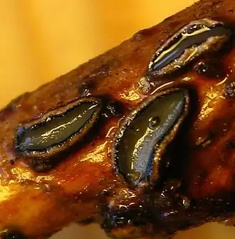 Die Fruchtkörper sind längliche bis lippenförmige Apothecien von 3 bis 10 mm Durchmesser. Sie erscheinen zuerst auf den Ästen als holzfarbene Rippen, die dann bei Reife die Rinde durchbrechen und die graue, manchmal auch gelbliche sporenbildende Schicht, das Hymenium freigeben. Dieses ist von einem dünnen schwarzen Excipulum (äußere Zellschicht) umgeben, das in das Holz eingesenkt ist.
