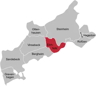 Die beiden Rittergüter Vordereichholz und Hintereichholz gehörten bis zu den Napoleonischen Kriegen zum Amt Steinheim im Hochstift Paderborn. Von 1807 bis 1813 gehörten sie zum Kanton Steinheim des Königreichs Westphalen und lagen seitdem auf dem Gebiet der Gemeinde Vinsebeck. Im 20. Jahrhundert entstand östlich der beiden Güter an der heutigen Ostwestfalenstraße eine kleine Wohnsiedlung. Am 1. Januar 1964 wurde aus dem östlichen Teil der Gemeinde Vinsebeck (191 ha) unter Hinzufügung von Gebietsteilen der damaligen Gemeinden Bergheim (65 ha) und der damaligen Stadt Steinheim (11 ha) eine neue Gemeinde Vordereichholz gebildet, die bis 1969 zum Amt Steinheim im Kreis Höxter gehörte.[2][3] Am 1. Januar 1970 wurde die Gemeinde Vordereicholz durch das Gesetz zur Neugliederung des Kreises Höxter in die Stadt Steinheim eingegliedert, in der sie heute den Ortsteil Eichholz bildet.[4]