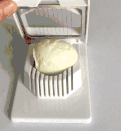 Ähnliche, entsprechend größere Geräte werden auch zum Schneiden von Mozzarella angeboten.