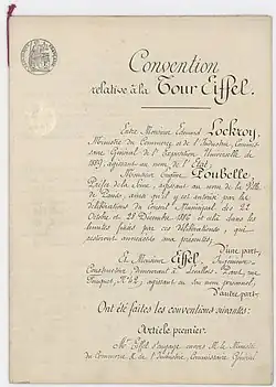 Das am 8. Januar 1887 zwischen Minister Édouard Lockroy, Minister für Handel und Industrie, Präfekt Eugene Poubelle und Gustave Eiffel unterschriebene Abkommen, das die Bedingungen für den Bau und Betrieb des 300-Meter-Turms regelt