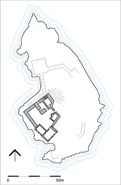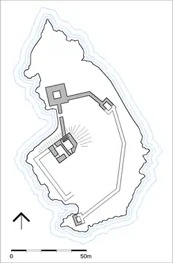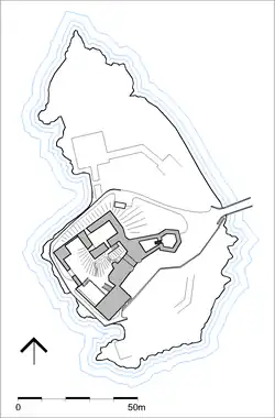 Wahrscheinlich im späten 14. oder Anfang des 15. Jahrhunderts wurde die Ringmauer zu Gunsten einer kleineren Verteidigungsanlage aufgegeben. Diese umschloss jetzt nur noch etwa 25 Meter im Quadrat, der Eingang lag im Osten. Gründe für diese Änderung sind nicht bekannt.[24]