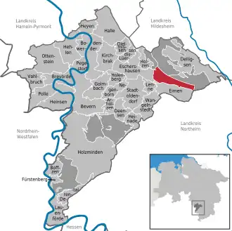 Es hat eine Fläche von 12,91 km²[1] und grenzt im Uhrzeigersinn im Norden an das gemeindefreie Gebiet Grünenplan, im Norden und Osten an das gemeindefreie Gebiet Wenzen, im Süden an die Gemeinde Eimen und im Westen an die Stadt Eschershausen sowie das gemeindefreie Gebiet Eschershausen des gleichen Landkreises.