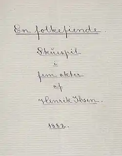 Ein Volksfeind (norwegisch: En Folkefiende) ist ein gesellschaftskritisches Drama des norwegischen Schriftstellers Henrik Ibsen aus dem Jahr 1882. Leitmotive sind Wahrheit und Freiheit sowie Mehrheit und Recht. Besonders beanstandet Ibsen die öffentliche Meinung, die oft als Wahrheit akzeptiert werde. Er schrieb Ein Volksfeind als Antwort auf die Kritik an seinen Dramen Nora oder Ein Puppenheim und Gespenster. Beide wurden zu seiner Zeit als skandalös betrachtet, da sich Ibsen gegen die herrschenden Konventionen wandte.[1] Ibsens letztes Gesellschaftsdrama Ein Volksfeind hatte, wie von ihm erwartet, trotz des brisanten Themas beim Publikum und der Theaterkritik Erfolg und wird auch heute noch häufig aufgeführt und als Schullektüre eingesetzt.[2]