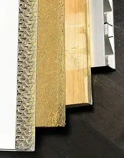 Seit der Nachkriegszeit werden Einbauküchen hingegen meist aus Spanplatten gefertigt. Fronten sind furniert, foliert, laminiert oder lackiert oder in jüngerer Zeit mit Metallblech und -folien beklebt. Türen sind manchmal auch aus Massivholz oder aus Aluprofilen mit Glaseinsatz. Die Rückwände und Rückseiten sind meist unbehandelt, so dass hier ebenso wie an Kanten Feuchtigkeit und Dämpfe ihre Spuren hinterlassen können. Einige Anbieter verzichten vollkommen auf Holzwerkstoffe und verwenden zum Bau von Einbauküchen Edelstahl. Als Trend wird immer wieder auch auf ungewöhnliche Materialien zurückgegriffen, wie etwa Glasfaserverstärkter Kunststoff (GFK), Keramik und Beton. Im Innenleben (Ausfütterung) werden manchmal auch Recyclingmaterialien verwendet, beispielsweise Pappen oder Textilien, die jedoch wie Holzwerkstoffe auf Klebstoffe angewiesen sind.