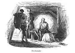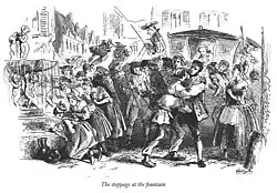 - Dickens arbeitete ab 1836 eng mit dem Graphiker Hablot Knight Browne (1815–1882) zusammen. Sein Pseudonym „Phiz“ wählte er in Anpassung an Dickens Pseudonym „Boz“. Der Autor forderte, dass der Zeichner die Erinnerungen des Protagonisten-Erzählers in eine objektive oder dramatische Sichtweise der dritten Person übersetzt.[26] Einige seiner Illustrationen enthalten Details, die nicht im Text enthalten sind, aber einen Charakter oder eine Situation beleuchten. So werden Ereignisse zusätzlich kommentiert. Die Bilder können also mehr aussagen, als der Erzähler in seinem Text sagt. Dickens untersuchte die kleinsten Details und verlangte manchmal Modifikationen.