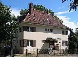 Das unter Denkmalschutz[1] stehende, zweigeschossige Gebäude hat ein steiles Walmdach, die danebenliegende Garage ein Flachdach.