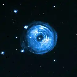 V838 Monocerotis ist etwa 20.000 Lichtjahre entfernt. Im Januar 2002 beobachtete das Hubble-Teleskop einen heftigen Helligkeitsausbruch.