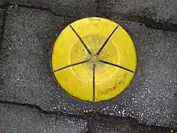 Ein Einkaufswagenstopper ist eine aus Kunststoff bestehende kreisrunde Scheibe, die in der Mitte eine Vertiefung hat und auf Supermarktparkplätzen auf dem Boden von Parkbuchten aufgeklebt wird.[1]