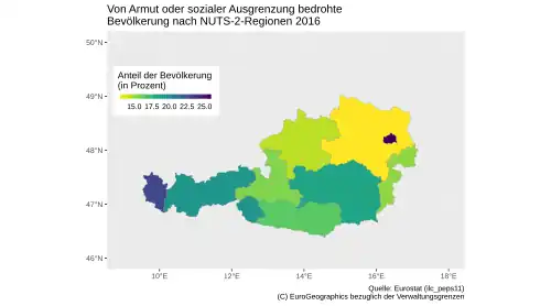 Die von Armut oder sozialer Ausgrenzung bedrohte Bevölkerung Österreichs ist ebenso räumlich ungleich verteilt. Allgemein lässt sich hier feststellen, dass der Osten Österreichs weniger armutsgefährdet ist, als der Westen. Auch hier stellt Wien wiederum eine Ausnahme dar, da hier österreichweit die höchste Armutsgefährdung der Bevölkerung (26,7 %) angenommen wird. Die geringste Armutsgefährdung findet sich in Niederösterreich (12,6 %).[17]