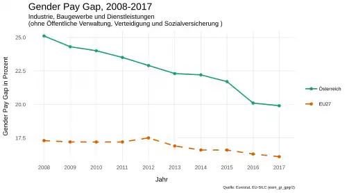 Die Erhebung zeigt außerdem, dass das geschlechtsspezifische Verdienstgefälle in Österreich weit über dem EU27-Durchschnitt liegt. Im Jahr 2008 beträgt dieser 17,3 %, was einen Unterschied von 7,8 Prozentpunkten entspricht. Diese Kluft konnte zwar über die Zeit hinweg reduziert werden, im Jahr 2017 beträgt diese jedoch noch immer 3,8 Prozentpunkte. Im Vergleich mit anderen europäischen Ländern weist Österreich überdurchschnittlich hohe Werte auf. (Siehe zum Beispiel: Einkommensverteilung in Ungarn).[10]