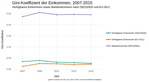 - ↑ a b c Gini-Koeffizient des verfügbaren Äquivalenzeinkommens - EU-SILC Erhebung [ilc_di12]. Abgerufen am 8. Mai 2019.