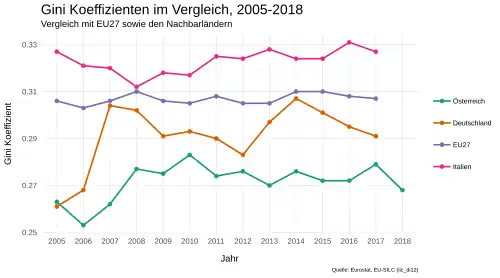 Im Vergleich mit dem durchschnittlichen Gini-Koeffizienten der EU27-Staaten zeigt sich, dass Österreich seit Beginn der Aufzeichnungen im Jahr 2005 stets unterhalb dieses Schnitts liegt. Im Jahr 2017 beträgt der Unterschied zu den EU27-Staaten 0,028 Punkte. Ebenso liegt Österreich unter den Gini-Werten seiner Nachbarländer Deutschland und Italien, welches als einziges Land in dieser Darstellung durchgehend über dem EU27-Durchschnitt liegt. Für das Jahr 2018 sind zwar bereits die Daten für Österreich vorhanden, jedoch fehlen noch die Vergleichswerte der anderen Länder, um weitere Parallelen zu ziehen.[4]