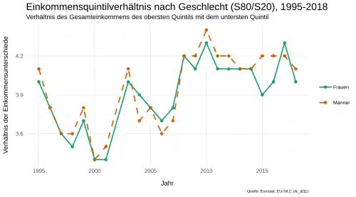 Bei Betrachtung der Daten der EU-SILC Erhebung lässt sich feststellen, dass die Werte der Frauen und Männer über weite Teile nahezu parallel verlaufen. Im Jahr 1995 beträgt der Wert der Männer 4,1 Punkte und jener der Frauen 4,0 Punkte. Dies bedeutet, dass Männer des obersten Quintils ein 4,1 Mal höheres Einkommen beziehen als jene Männer des untersten Quintils. Für die Gruppe der Frauen bedeutet dies ein viermal so hohes Einkommen des obersten im Vergleich zum untersten Quintil. Von diesem Punkt an sinkt das Einkommensquintilverhältnis, mit einer kurzen Unterbrechung, bis ins Jahr 2000 auf einen Wert von 3,4 Punkten für beide Geschlechter. Von dort an steigen die Werte über die Jahre hinweg, mit Ausnahme der Jahre 2004, 2005, 2006 sowie 2009, bis diese im Jahr 2010 mit 4,4 Punkten für die Gruppe der Männer und mit 4,3 Punkten für die Gruppe der Frauen den höchsten Wert der derzeitigen Datenlage erreichen. Im Jahr 2017 liegt der Wert wieder auf dem gleichen Wert wie im Jahr 2010. 2018 ist ein leichtes Absinken zu beobachten: Das Einkommensquintilverhältnis der Männer beträgt 4,1 Punkte, jenes der Frauen 4,0 Punkte, somit spiegeln diese Werte jene Verhältnisse des Jahres 1995 wider.[9]