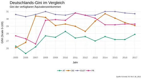 Im Vergleich mit angrenzenden EU-Nachbarländern hatte Deutschland im Jahr 2018 mit einem Gini-Koeffizient von 31,1 die zweithöchste Einkommensungleichheit nach Luxemburg (33,2). Alle anderen EU-Nachbarländer haben einen niedrigeren Gini-Koeffizient zwischen 28,5 (Frankreich) und 24,0 (Tschechien).[34]