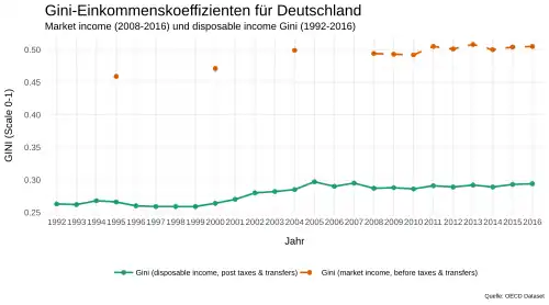 Die Einkommensungleichheit in Deutschland hat sich nach Angabe der OECD seit 1995 verstärkt und hat zwischen den Jahren 2000 und 2008 stärker zugenommen als in jedem anderen OECD-Land.[12] Seit 2009 ist die Ungleichheit, gemessen am Gini-Koeffizienten (Erklärung im nächsten Abschnitt), nach den Daten von der OECD (2009: 0,288; 2016: 0,294) und Eurostat (2009: 0,291; 2017: 0,291) auf diesem Niveau ungefähr verblieben.[13][14]