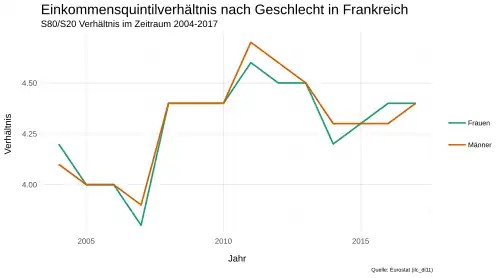 In der beigefügten Grafik[12] ist das S80/S20-Quintilsverhältnis nach den Geschlechtern aufgeteilt. Es zeigt sich, dass in dieser Statistik zwischen Männern und Frauen keine, beziehungsweise kaum Unterschiede bestehen und beide Kurven über die Zeit hinweg denselben Verlauf nehmen.
