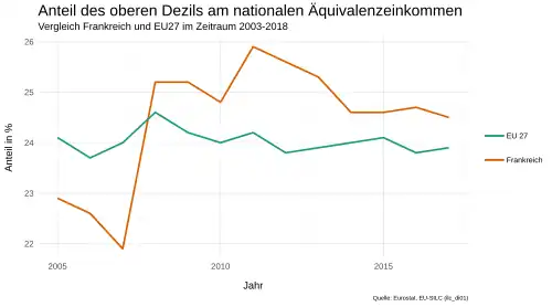 Diese Maßzahl drückt aus, welcher Anteil des Gesamteinkommens den bestverdienenden 10 Prozent der Gesamtbevölkerung zufließt. Von 2008 bis 2011 stieg dieser Wert von 25,2 % auf 25,9 % an. Anschließend sank er wieder ab, 2017 belief er sich auf 24,5 %.[13] Damit verfügten 2017 die 10 Prozent der Bevölkerung Frankreichs mit den höchsten Einkommen über 24,5 % des Gesamteinkommens. Im gleichen Jahr belief sich der gewichtete EU-Durchschnitt des Top-10-%-Anteils auf 23,9 %.[13]