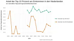 Sortiert man Personen aufsteigend nach Einkommen und teilt diese in zehn gleich große Gruppen ein, also in jeweils 10 % der Gesamtbevölkerung, so erhält man die Einkommensdezile einer Volkswirtschaft. So wird sichtbar, welchen Anteil ein Dezil (z. B. das zehnte Dezil) am Gesamteinkommen hat. Der Top 10 % Einkommensanteil beschreibt das verfügbare Äquivalenzeinkommen der reichsten 10 % am Gesamteinkommen der Niederlande (somit sind Sozialversicherungsbeiträge als auch Lohnsteuer in der Berechnung inbegriffen).[14] In den Niederlanden lag der Anteil der reichsten 10 % im Jahr 1995 bei 23 % des nominellen Äquivalenzeinkommens. Im Jahr 2008 lag der Anteil bei 22,3 % und 2017 bei 22 %[15]. Der Anteil der Top 10 % ist seit 1996 trotz Auf- und Abschwankungen gesunken. Des Weiteren liegt die Niederlande unter dem EU-27 Durchschnitt: 2017 lag der Anteil am Gesamteinkommen der Top 10 % bei 23,9.