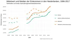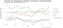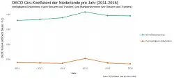 Im Jahr 1987 betrug die Armutsquote in den Niederlanden vor staatlichen Leistungen noch 26,4 %, nach den staatlichen Verteilungsmaßnahmen nur mehr 6,4 %. Schon wenige Jahre später im Jahr 1993 betrug die Armutsquote vor staatlichen Leistungen 27,9 % und fiel nur mehr auf 9,8 %. Dieser Zeitraum stellt auch die markantesten Veränderungen in der Nachkriegszeit dar. Diese Entwicklung ist auch bei den Gini-Koeffizienten ersichtlich, sowohl vom Markteinkommen als auch von den verfügbaren Einkommen. Hier zeigt sich, dass von 1987 bis 1993 der Gini-Koeffizient der verfügbaren Einkommen von 27,5 auf 31,1 und der Gini-Koeffizient der Markteinkommen von 40,3 auf 43,1 anstieg.[5] Im Jahr 1995 kam es zu einer Steuerreform, in der eine progressivere Einkommensteuer umgesetzt wurde. Dies führte zu einem sinkenden Gini-Koeffizienten bis zum Jahr 2005, seither ist mit Ausnahme von kurzfristigen Schwankungen nach der Wirtschaftskrise 2008 eine relativ konstante Entwicklung ersichtlich.[6]