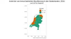 Allgemein ist der Anteil der von Armut bedrohten Bevölkerung in den Niederlanden 2016 bei Werten zwischen 13,4 % (Noord-Brabant) und 23,7 % (Groningen) angesiedelt. In anderen Worten, während beispielsweise in der Provinz Utrecht 2016 etwas mehr als jede zehnte Person von Armut und sozialer Ausgrenzung betroffen ist, ist es in Groningen jede fünfte. In den einkommensstärksten Provinzen Noord-Holland und Utrecht beträgt die Wahrscheinlichkeit, Armut zu erfahren und sozialer Ausgrenzung ausgesetzt zu sein, 18,1 bzw. 15,2 %. Die beiden Regionen liegen mit diesen Werten etwa im niederländischen Durchschnitt, der sich 2016 bei 16,7 % befindet. Im Vergleich zur Verteilung des verfügbaren Haushaltseinkommens ist des Weiteren auffällig, dass ein niedrigeres Einkommen nicht notwendigerweise mit einer höheren Armutsgefährdung in Verbindung zu bringen ist. So verfügt die Bevölkerung in der Region Overijssel 2016 nur ein vergleichsweise geringes verfügbares Einkommen, schneidet allerdings im Bezug auf die Armutsgefährdung nicht schlechter ab als viele Regionen mit höheren Einkommen und sogar besser als eine der einkommensstärksten Regionen Noord-Holland. Ähnliches gilt mit Ausnahme von Groningen auch für alle anderen Regionen im Norden. Wirft man einen Blick auf die Region Noord-Holland ist sogar eine positive Korrelation zwischen Einkommen und der Wahrscheinlichkeit von Armut betroffen zu sein zu beobachten.