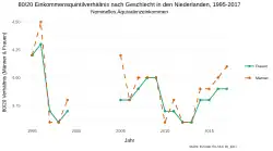 Das Einkommensquintilverhältnis kann zwischen 1995 und 2017 (mit einer Datenlücke zwischen 2000 und 2004) getrennt nach Geschlecht untersucht werden. Als Einkommen wird dabei das verfügbare Äquivalenzeinkommen von Männern und Frauen herangezogen. Über den betrachteten Zeitraum liegt das 80/20-Verhältnis für beide Geschlechter bei einem Wert von rund 4 und verändert sich über die Zeit nur geringfügig. Ein Verhältnis von 4 bedeutet, dass die Top 20 % der Bevölkerung in der Einkommensverteilung rund 4-mal so viel Einkommen besitzen, wie der Teil der Bevölkerung mit den niedrigsten 20 % der Einkommen. Generell ist das 80/20 Einkommensquintilverhältnis für Männer fast über den gesamten Zeitraum geringfügig höher. Die höchste Differenz zwischen den Top 20 % und den niedrigsten 20 % der Einkommen ist in den Niederlanden sowohl für Frauen als auch für Männer im Jahr 1996, mit einem Verhältnis von 4,3 für Frauen 4,5 für Männer zu beobachten. Dieser Wert fällt danach für beide Geschlechter etwas und erreicht den geringsten Wert mit 3,7 für Frauen in den Jahren 1999, 2010 und 2011 und 3,6 für Männer im Jahr 2010. Nach 2010 steigt das Einkommensquintilverhältnis für beide Geschlechter wieder an, wobei jener Wert für die Männer im Vergleich zu den Frauen wiederum etwas stärker zunimmt.