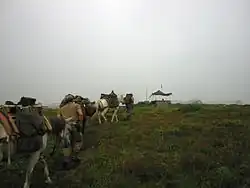 Soldaten des Eins-/AusbZ TrgTWes 230 und PzGrenBtl 391 bei der Versorgung des Observation Point Zitadelle (auf 2400 m Seehöhe) während der Tragtiererprobung des deutschen Heereskontingentes im Kosovo mit ausschließlich einheimischen Tragtieren, 2002