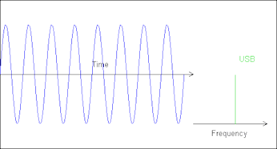 Durch das zu modulierende reelle Basisbandsignal entstehen bei Amplitudenmodulation symmetrisch zur Trägerfrequenz (englisch Carrier) zwei zusätzliche Frequenzbereiche. Wenn die Modulationsfrequenz beispielsweise im Frequenzbereich zwischen 300 Hz und 4000 Hz schwankt, wird ein Frequenzband der Gesamtbreite 8000 Hz erzeugt und benötigt. Den oberen belegten Frequenzbereich bezeichnet man als USB (englisch upper side band); der untere belegte Frequenzbereich heißt LSB (englisch lower side band); beide Frequenzbereiche enthalten bei einer Amplitudenmodulation exakt die gleiche Information.