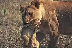 Als Eintrageverhalten (engl.: retrieving, selten auch: retrieval behaviour) wird eine unter Säugetieren weit verbreitete Verhaltensweise aus dem Komplex des Sozialverhaltens bezeichnet, bei dem ein Jungtier von erwachsenen (meist weiblichen) Artgenossen mit dem Maul gepackt und an einen anderen Ort gebracht wird.[1] Beobachten kann man dies unter anderem bei Hunden und Katzen, Meerschweinchen und Goldhamstern, Ratten und Mäusen. Selbst Nilpferden wurde dieses Verhalten zugeschrieben, und auch bei Vögeln wurde es beobachtet.[2] In der Regel verfallen die Jungtiere sofort in eine Tragestarre, sobald sie gepackt wurden; Goldhamster tragen ihre Jungen gelegentlich auch in den Backentaschen ein.[3] „Das Eintragen kann bereits wenige Minuten nach der ersten Geburt bei einer isoliert aufgezogenen Ratte zum erstenmal stattfinden.“[4]