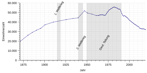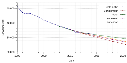 Die Bertelsmann Stiftung, deren Ausgangsdaten vom 30. Juni 2007 stammen, geht davon aus, dass der Bevölkerungsrückgang einschließlich der Wanderung von 2009 bis 2030 28,9 % (10.240 Personen) betragen wird, der natürliche Bevölkerungsrückgang wird 22,1 % betragen. Das Durchschnittsalter wird dann bei 58,9 Jahren liegen.