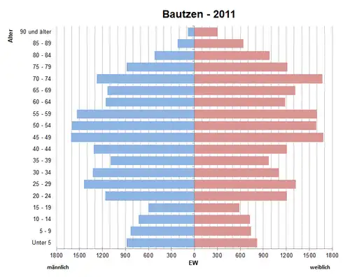 - ↑ Datenbank Zensus 2011, Bautzen, Stadt, Alter + Geschlecht ( des vom 21. Juni 2013 im Internet Archive) Info: Der Archivlink wurde automatisch eingesetzt und noch nicht geprüft. Bitte prüfe Original- und Archivlink gemäß Anleitung und entferne dann diesen Hinweis.