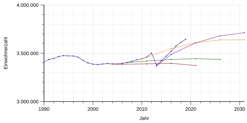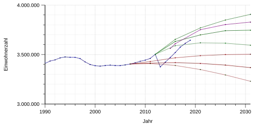 2012 wurde vom Berliner Senat eine neue Bevölkerungsstudie[45] vorgestellt, diese bestand aus drei Wachstumsprognosen „mittlere“, „obere“ und „untere“ Variante. Wie schon bei den Prognosen der Bertelsmann-Stiftung (siehe oben) sieht die neue Prognose eine wachsende Bevölkerung vor, insbesondere im Vergleich zur Vorgängerstudie. Alle drei Varianten sehen ein Wachstum bis 2030 vor, lediglich bei der „unteren Variante“ nimmt die Bevölkerung am Ende des Zeitraumes leicht ab, liegt aber immer noch deutlich über dem Bevölkerungsstand 2011. Die prognostizierten Bevölkerungen liegen für 2030 zwischen 3,6 und 3,9 Millionen Einwohnern.