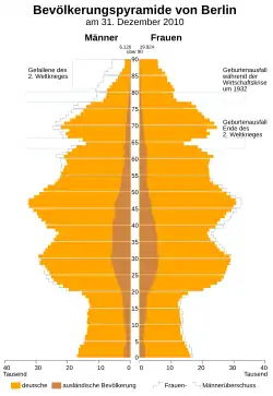 Die Bevölkerung Berlins ist von der wechselvollen Geschichte der Stadt geprägt. In Berlin lebten am 31. Dezember 2024 nach amtlicher Bevölkerungsfortschreibung auf Grundlage des Zensus 2022 3.685.265 Einwohner auf einer Fläche von 891,82 Quadratkilometern. Nach der Fortschreibung auf der Grundlage des Zensus 2022 waren es am 15. Mai 2022 genau 3.596.999, was eine Überhöhung der vorher verwendeten, aus dem Zensus 2011 fortgeschriebenen Zahlen um knapp 129.000 bedeutete.[1] Die Bevölkerungsdichte der Stadt betrug 4.132 Einwohner pro Quadratkilometer.